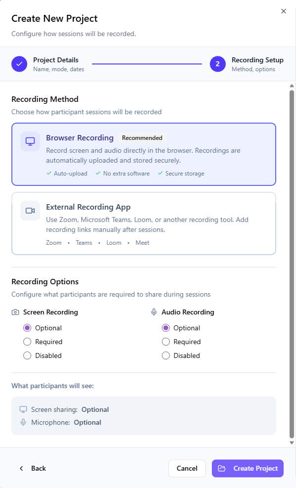 Click Next. Then select the Recording Method, which determines how participant sessions will be recorded.