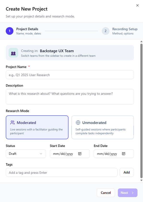 Unmoderated: Self-guided sessions where participants complete tasks independently. By default, the unmoderated mode uses browser-based recording to capture screen, audio, and interaction data automatically. This mode is ideal for larger sample sizes, geographic distribution, and when participants prefer flexibility in scheduling.